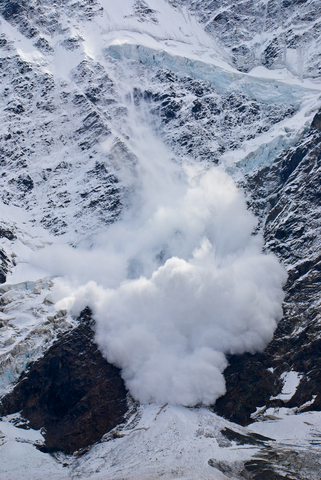 a large mass of snow, ice, rocks or other material sliding or falling swiftly down a mountainside; something resembling such an event